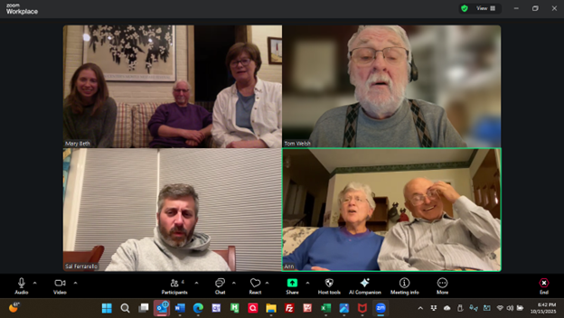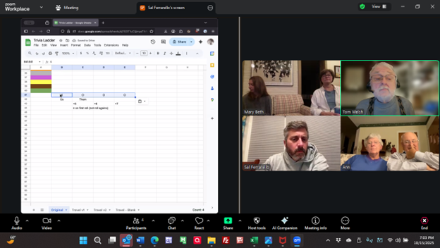 | At 1820, I opened the zoom room and was joined by Santo and Ann, Sal, And Bob, Mary Beth, and Lindsey, visitng from Brooklyn. We played 2 sets of Trivial Pursuit ladder, with a 5-0-1 record and finsihed box 2 of the Tricial Pursuit cards. We’ll start Box 3 on November 19. | |||