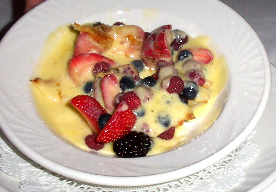 Tropical Fruit Crème Brûlée ($8). With a glass of something good but unidentified | Seasonal Berry Gratin ($8) With a glass of La Caliera Moscato D'Asti, Piedmont 05 ($8.50) |