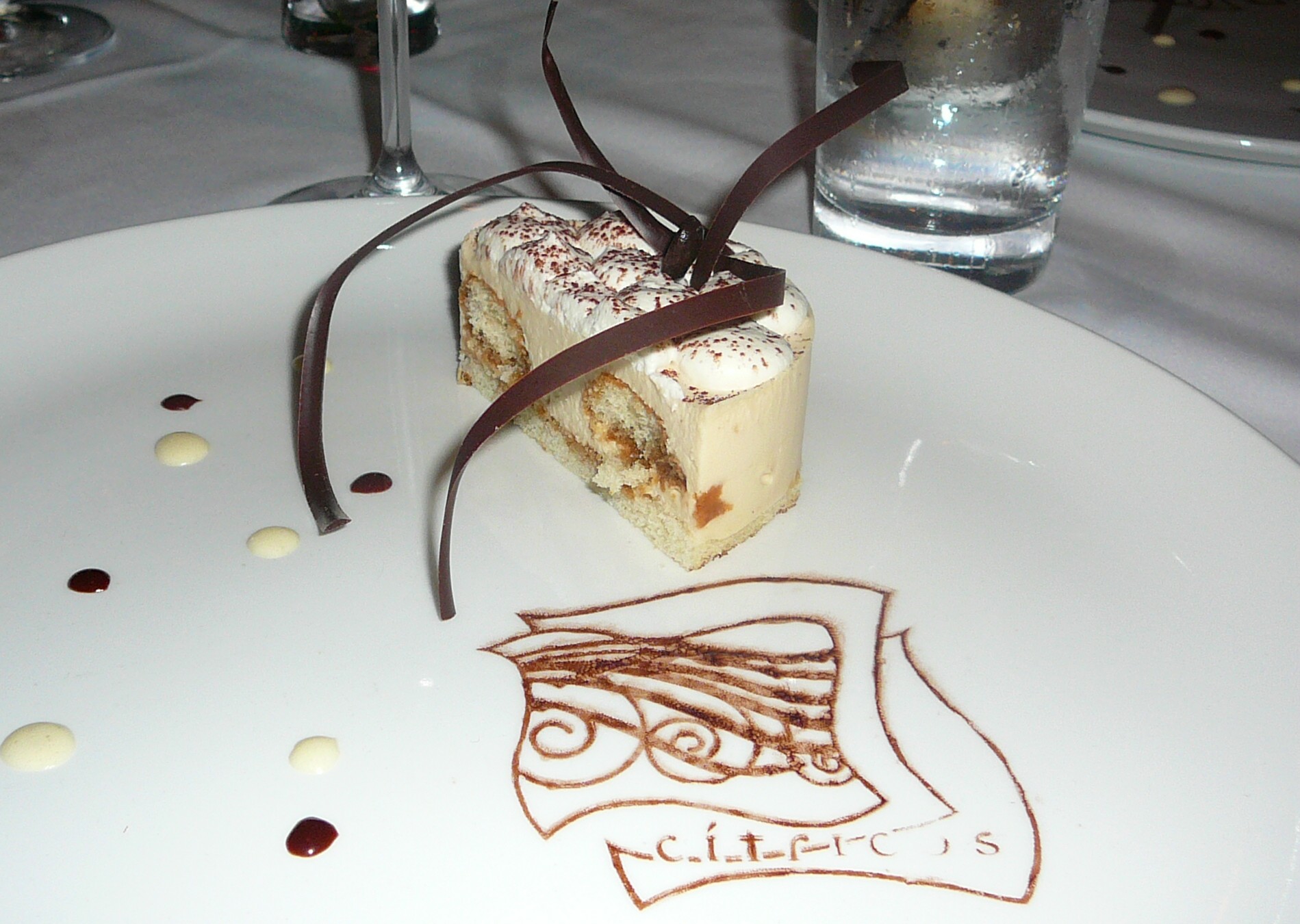 split the Tiramisu with Chocolate and Vanilla Sauces