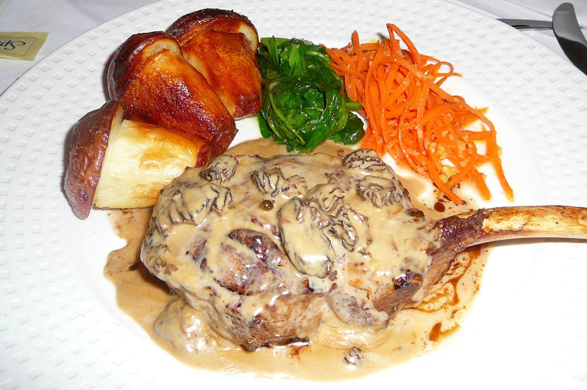 , grilled, and topped with French Morel mushroom sauce. Served with mushroom-carved potatoes and wilted spinach.