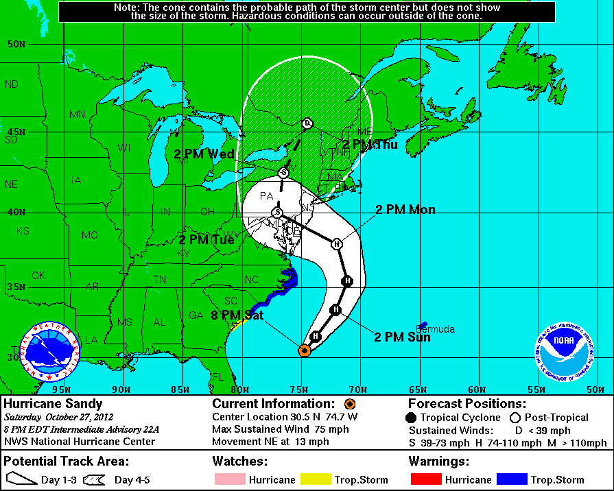 2012-10-28 1100 EDT Hurricane 75 mph NE at 14 mph |