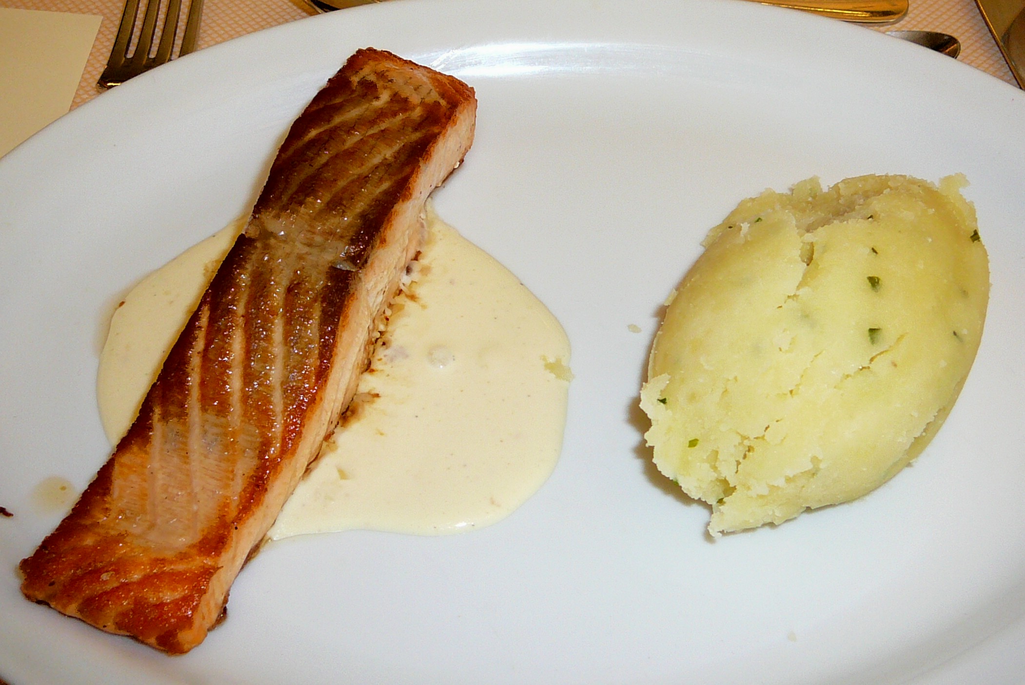 | Following our tour, we walked (trammed) to La Flottille for lunch. I had preselected a grilled salmon followed by a seasonal fruit tart made of pears. |