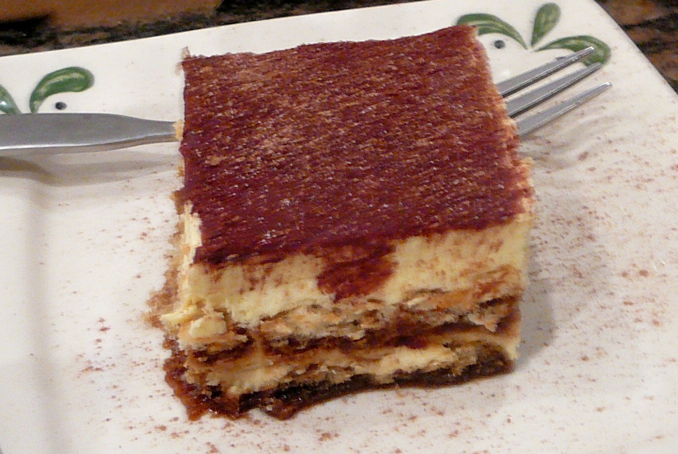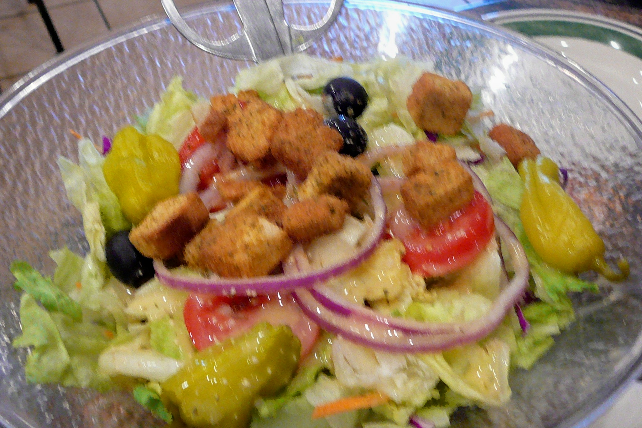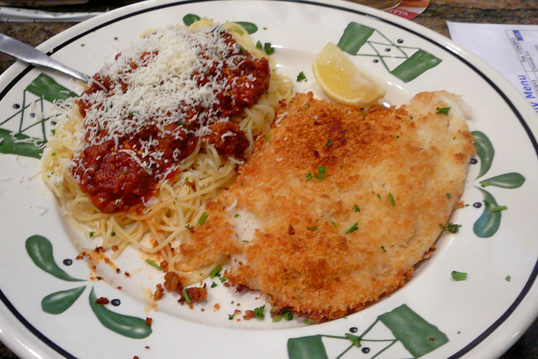 Margaret has selected Olive Garden for Tuesday's lunch. Erin, who is new, was our server. Margaret had Eggplant Parmigiana (12.49) and Tiramisu. Lyd had a pizza (10.99) with sausage, mushrooms and onions, and also had Tiramisu. I had the Parmesan Encrusted Tilapia (15.49) and finished with Chocolate Mousse Cake (4.99). | |||||||||||||||||||||