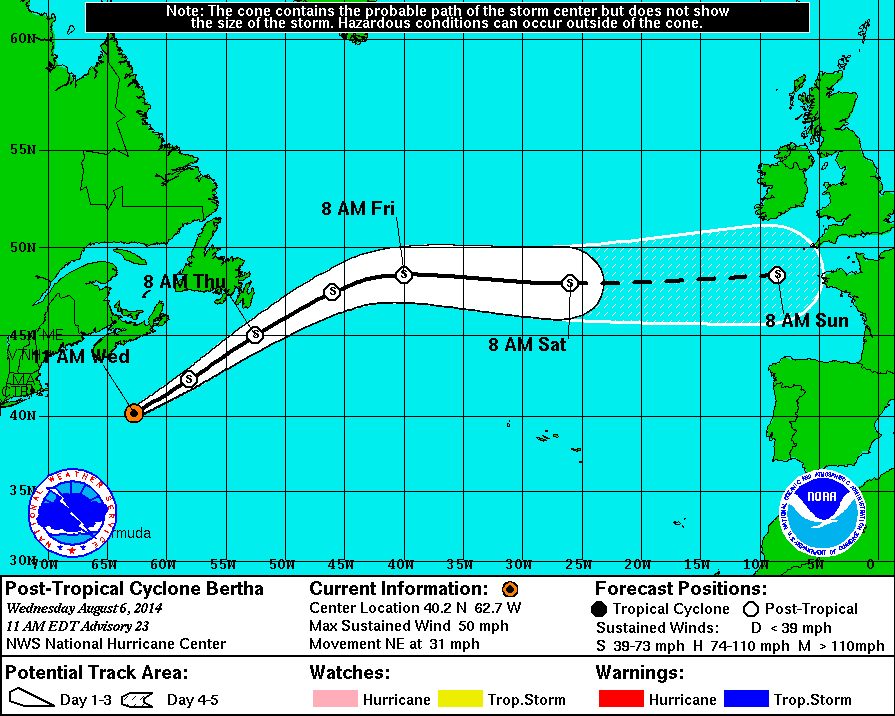 2014-08-06 1100 EDT Post-Tropical Cyclone 50 mph NE at 31 mph |