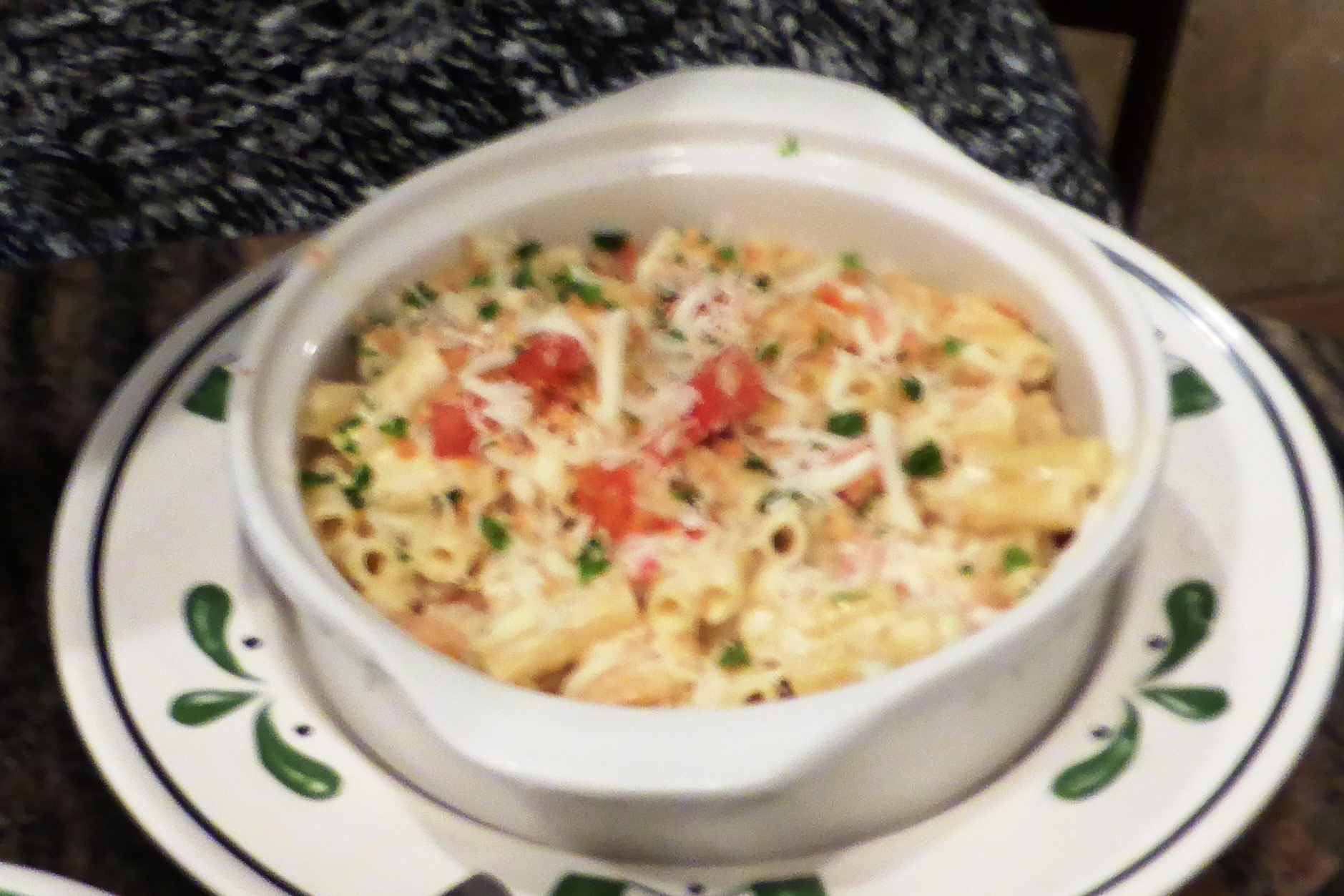 | Margaret took us to Olive Garden where Rachael was expecting us. With a salad bowl, Margaret had the luncheon portion of eggplant parmigiana (9.69) while Lyd had the new Baked Parmesan Shrimp (15.49) and I had the new Stuffed Rigatoni with Sausage (14.99). Margaret and I both had the Pumpkin Cheese Cake (6.99). | |||