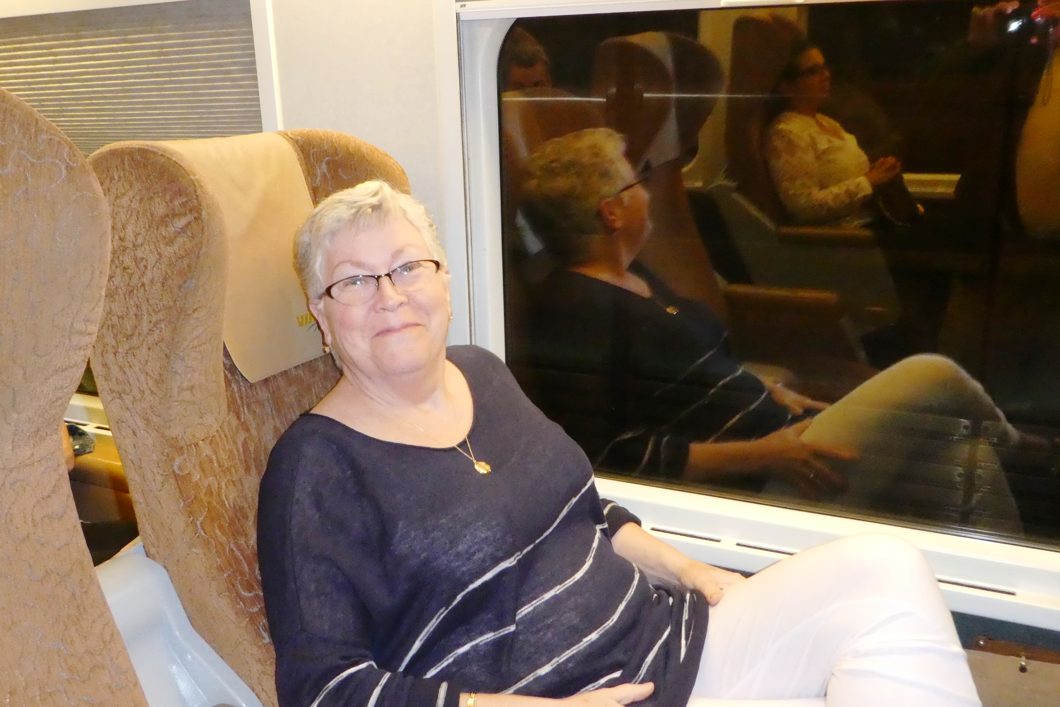 Down the escalator, we were directed to and boarded car #1 and secured seats 11A&B on the left side of a luxurious car.