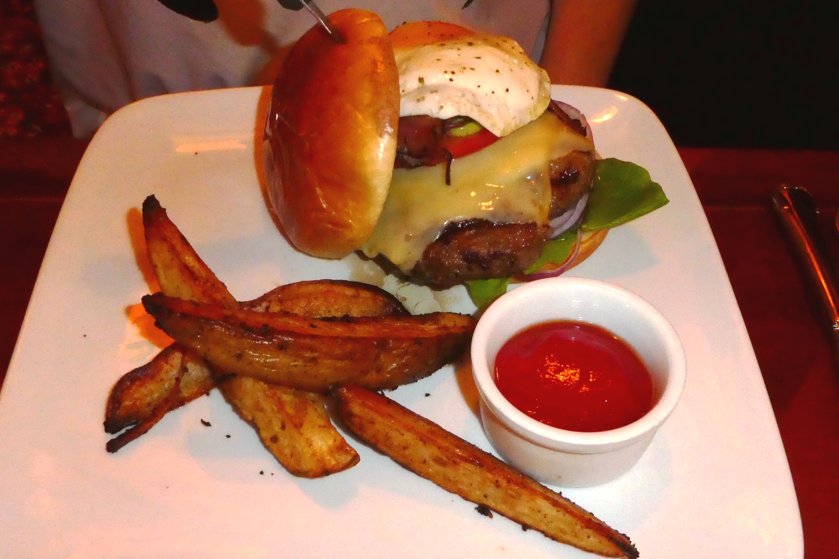 Lew's entrée was the Grilled Wagyu Beef Burger (23) with gruyere cheese, pastrami, heirloom tomato, avocado, fried egg, toasted brioche, cognac mustard aioli and hand cut steak fries.