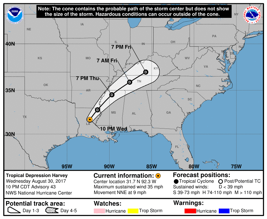 2017-08-23 1000 CDT Tropical Depression 35 mph NW at 9 |