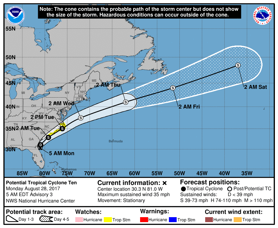 2017-08-28 0500 EDT Potential Tropical Cyclone 35 mph Stationary |