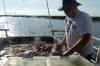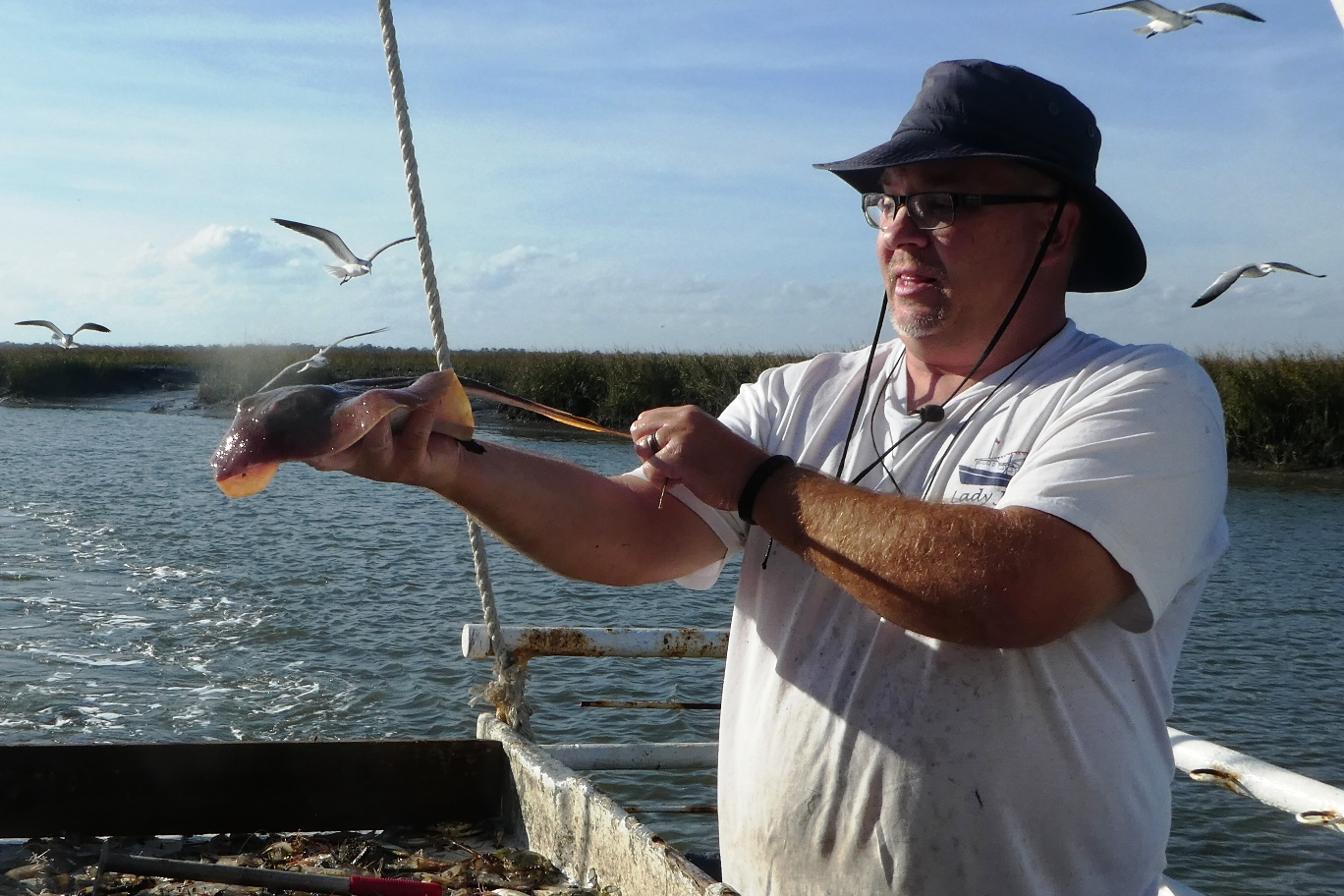 At 0608, it’s 61 in Brunswick, GA. After breakfast, we boarded a bus to Jekyll Island. First we toured the Sea Turtle Recovery Center and then had a tram tour of the homes of the rich and famous from the 1900’s in the Jekyll Island State Park. We returned in time for a lunch of Carolina Oyster Stew and Chopped Shrimp Salad. At 1415, we boarded a bus to the other side of town where we boarded the Lady Jane for a three hour experience shrimping in the Brunswick Estuaries. We caught, examined, and sometimes held a variety of seafood from fish to shrimp to crab. At 1645, we were back on the boat. At 1730, we enjoyed the cocktail party before going down to dinner at 1830. We both started with the Baked James River Oysters with blue crab, mushrooms, ham and green onions. Lew followed this with the Seared Red Snapper Oscar with crab, sweet potato pilaf, asparagus and wild onion bernaise, and I selected the Maple Glazed Seared Breast of Duck with carrots and sweet potato risotto. I skipped dessert, but Lew had to try the Bread and Butter Pudding. We went back to the room, and by 2120, we were in bed with the glass door open and 66.