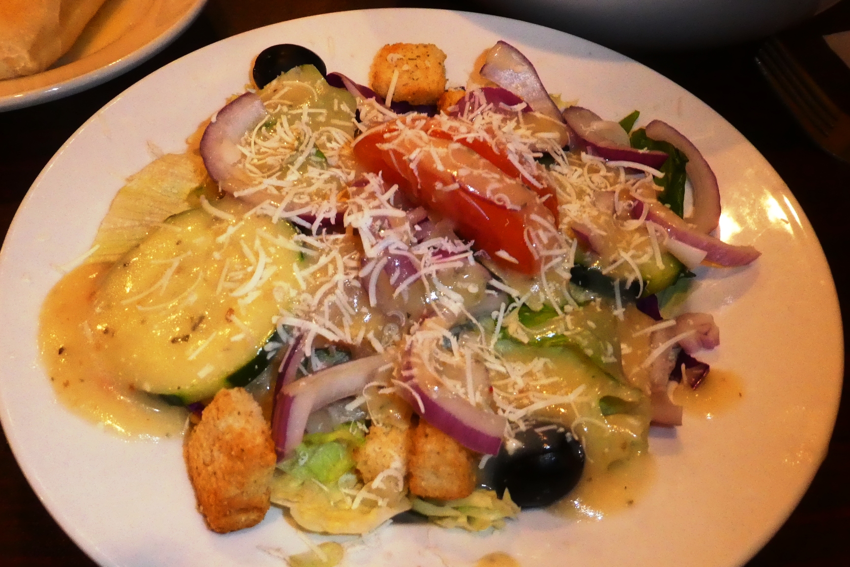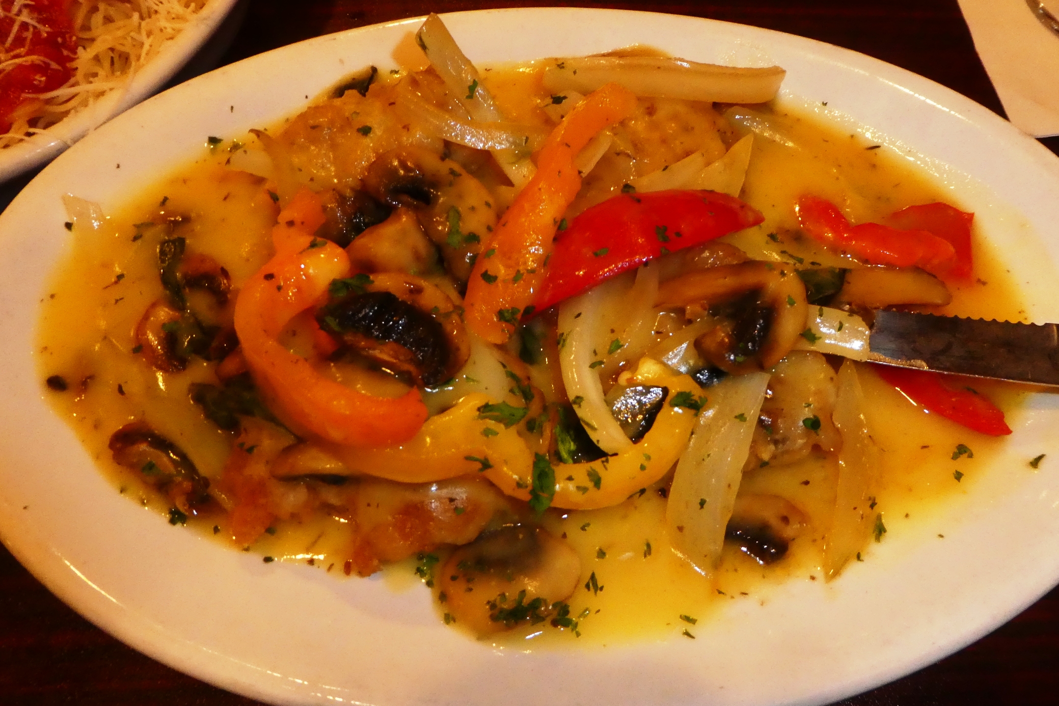 | Tom selected Fratellis for Thursday's lunch. Alyssa was our server. We started with a bottle of 19 Crimes (29) and an order of Mussels (12). Lew moved on to the Special Eggplant Parmesan (9.50) and I had the Chicken Joanna (11) which was overcooked. | |||||||||||||||||||||