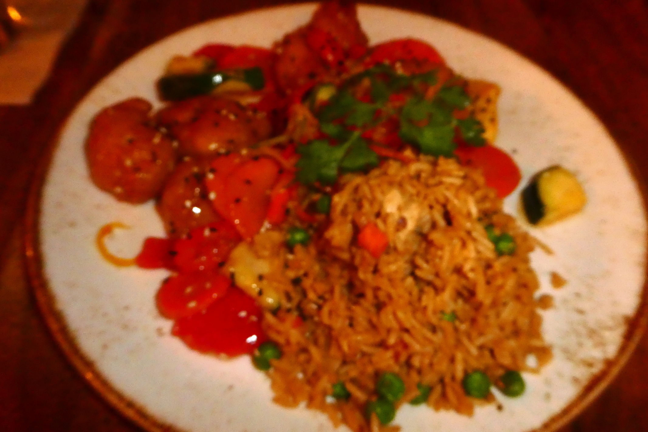 | It took 20 minutes to seat us, upstairs. Lew started with glasses of Pinot Grigio (8@). Though not on the menu, our server made, for me, a Rickshaw Rickey (11.75) with Titos Vodka. Lew’s entrée, as always, was the Dim Sum Basket for 2 (16.79), which she did not share. I selected the Crispy Honey Chicken (19.99) with Fried Rice (2) for mine. | |||||||||||||